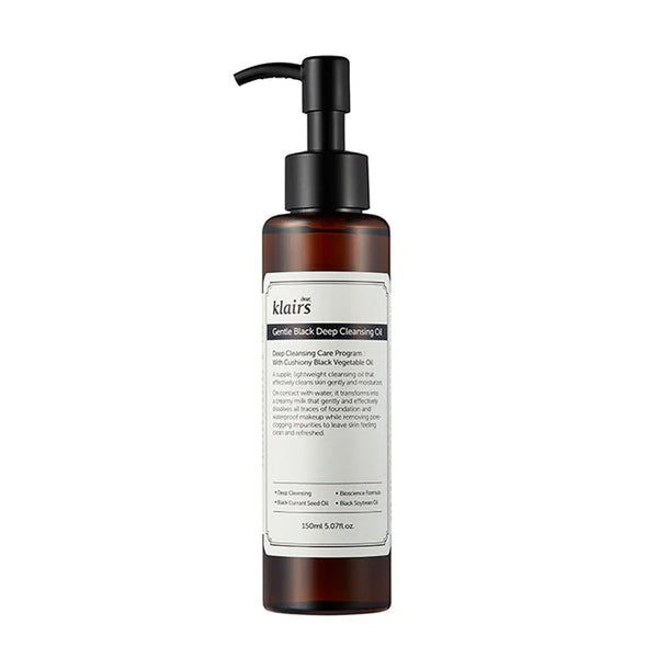Klairs Gentle Black Deep Cleansing Oil is formulated with Black Currant Seed Oil and Black Soybean Oil to help effectively remove makeup and excess sebum from the skin.