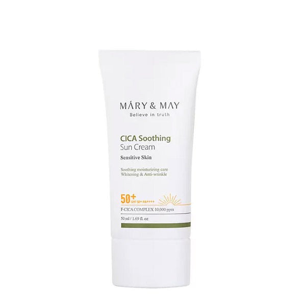Mary & May Cica Soothing Sun Cream moisturizes and soothes skin, and offers skin-brightening and anti-aging effects.